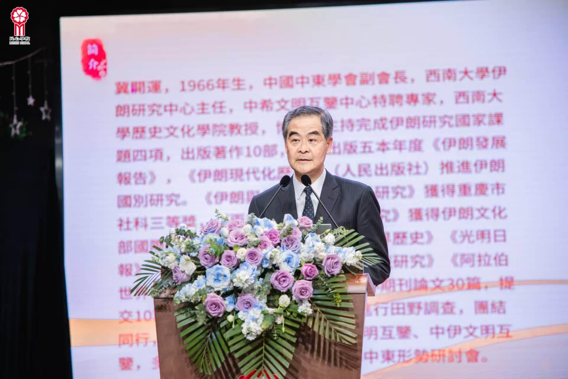 2026年4月10日,应香港特区前行政长官、全国政协副主席、广州民心港人子弟学校董事会主席梁振英邀请,知名伊朗研究学者冀开运教授莅临该校,为全校师生带来主题学术讲座。