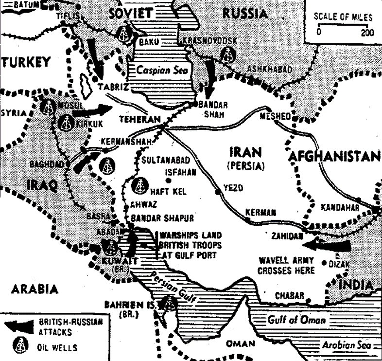 二战伊始,伊朗采取中立政策,但随后礼萨汗寻求“第三支力量”来打破英苏两国在伊朗问题上矛盾和利益方面达成的共识,礼萨汗寻求同英国达成秘密协议以免受苏联的威胁,而希特勒也同斯大林达成了协议,将伊朗排除在德国的优先关切范围内,希特勒的目的是遏制英国在伊朗的影响力,即便这种遏制是以苏联在伊朗进一步渗透为代价。根据美国驻伊朗官员斯图尔特的说法,1939年以后,伊朗愈发担心苏联的南下,因此秘密请求英国支持。尽管英国了解苏联对伊朗的巨大威胁和对其油田掌控的可能,但英国仍不愿提供对伊朗的任何承诺,后来英国曾考虑了一项对苏联的进攻计划,这项计划将以破坏伊朗的中立性和领土主权为前提对高加索地区的油田进行大规模破坏,使苏联石油资源瘫痪的同时,断绝德国未来进入这些地区的任何可能,而在另一方面苏联也准备好了应对英国从伊朗取道袭击的可能。这样的紧张局势在1940年的夏天达到了顶点,德国苏联间的微妙同盟和盟国间的敌意在伊朗日益加剧,希特勒希望将斯大林的野心从欧洲转移到波斯湾地区,因此英苏两国在伊朗的军事对抗变得愈发可能,事实上德国在对伊朗的态度和政策上同英国是没有太大差别的,尽管德国同伊朗政府保持了友好的关系,但伊朗仍然被作为筹码在秘密交易中被德国交给了苏联,换取苏联对其在其他地区进行扩张的默许。伊朗领土,再一次成为了世界强权博弈的战略缓冲区,斯大林推迟了对伊朗发动的全面进攻,因为他担忧英国可能对巴库油田的报复。时间来到1941年6月,伴随着德国入侵苏联,德、英、苏三国对伊朗的方针迎来了洗牌,苏联和英国在伊朗问题上的立场再次走到了一起,对于两国而言,数千名德国人在伊朗的驻扎(主要是建筑项目中的技术人员和工程师)足够另其担忧,两国都曾为入侵伊朗制定好详细的军事计划,而当德国入侵苏联时,伊朗境内的德国小社区就为两国正当军事介入提供了最好的借口。